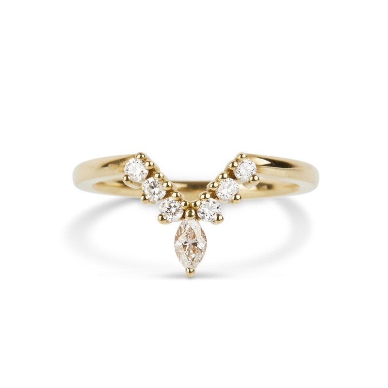 TheAura Diamond Ring features one marquise centre white diamond, with six round diamonds set in the 18ct yellow gold band. It can be worn alone, or stacked, and would also make a beautiful alternative wedding ring.This beautiful ring has been handcrafted i