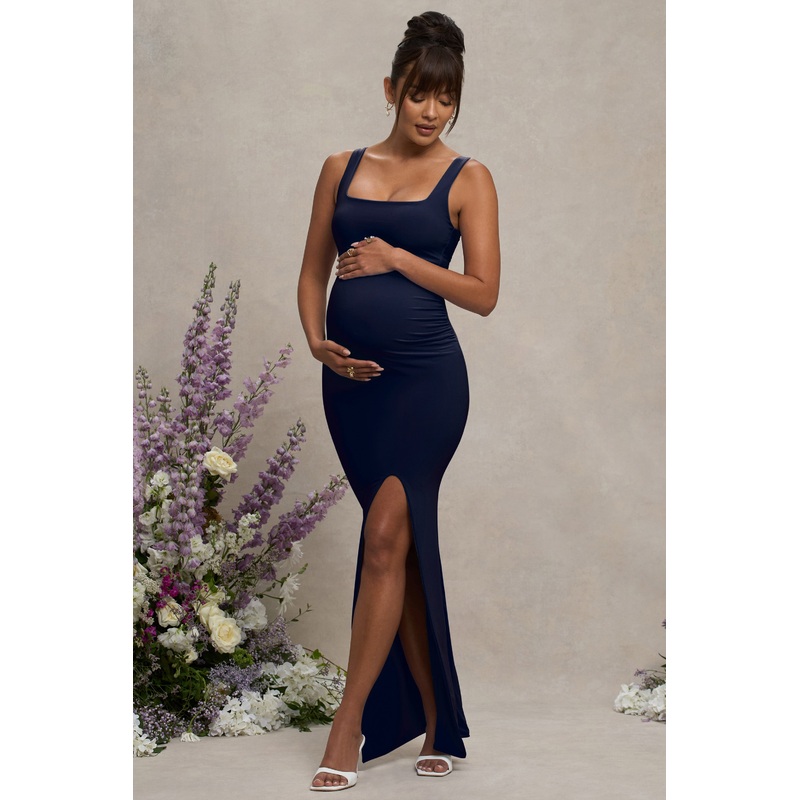 Avril | Navy Square Neck Maternity Maxi Dress with Split