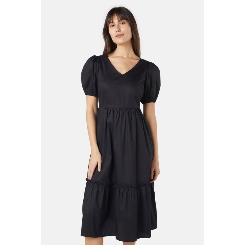 V neck midi dress- an elegant black midi dress to elevate your transeasonal spring wardrobe- soft v neckline- short puffed sleeve with an elastic cuff- midi length- tier at hem with exposed ruffle- made of a smooth cotton fabric- available in blackProduct