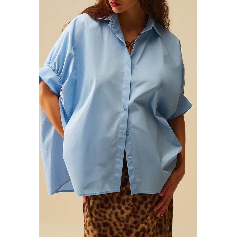 Crisp and contemporary, this oversized baby blue blouse is an effortless staple with a bold, fashion-forward edge. Crafted from 100% cotton poplin, it offers a breathable feel and a structured drape that holds its shape beautifully. The short sleeves and r