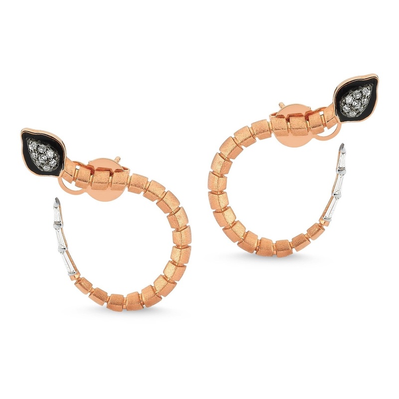The Baby Dragon Hoop Earrings are made from 14K rose gold with white diamonds. The diamonds on the dragon’s head are surrounded by black enamel