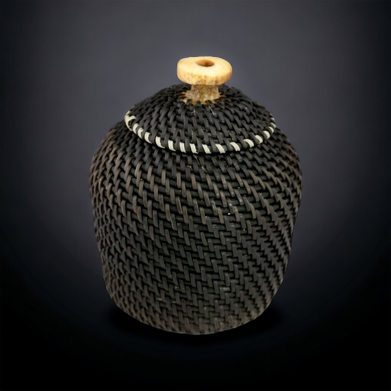 Whale Baleen Basket with Walrus Ivory handle and bottom-Made in Alaska and signed on bottom by artist Carl Hank*One of a kindSize - 3"W x 3"HBaleen is a material obtained by Inupiaq and St. Lawrence Islanders from harvested whales, particularly the bowhead