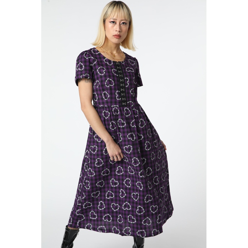 Punky Dress- Hook And Loop Fastenings At Front- All-Over 'Barbed Heart' Print- Gathered At Waist- Short Sleeve Style- Round Neckline- Made From Organic Cotton- Available In Black/PurpleProduct Code: DGFU059305