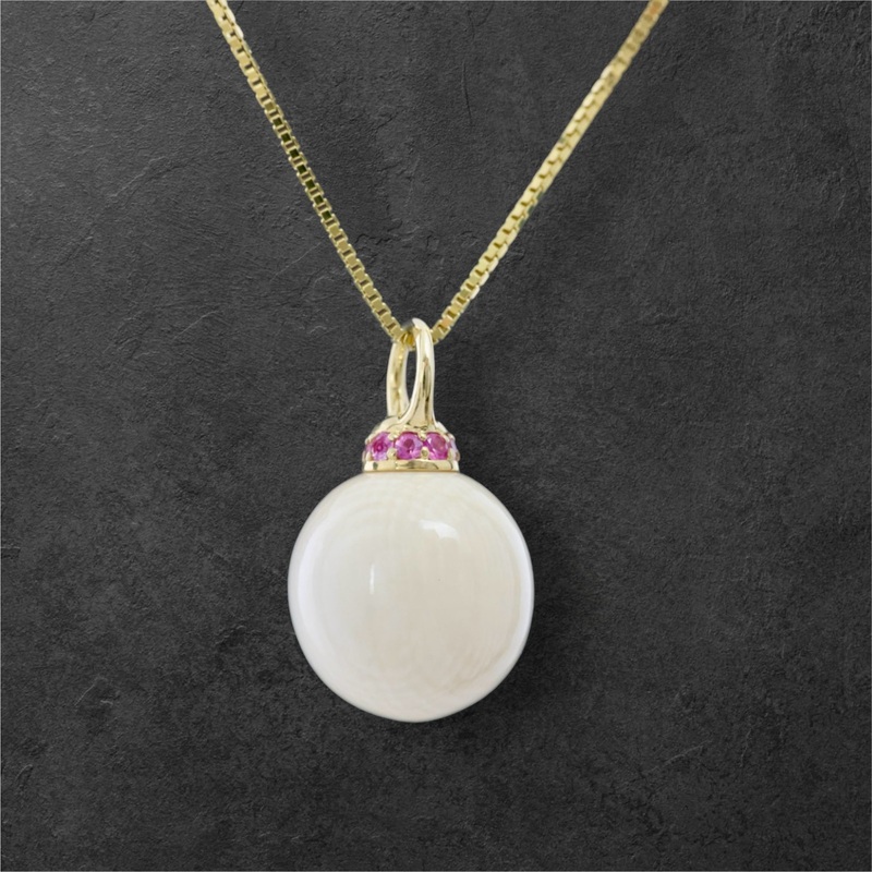 Woolly Mammoth Ivory, Pink Sapphire Accent & 14kt Gold Sizes - 12mm or 14mm Ivory Bead availableFossil information includedChain Sold Separately...Click Here!