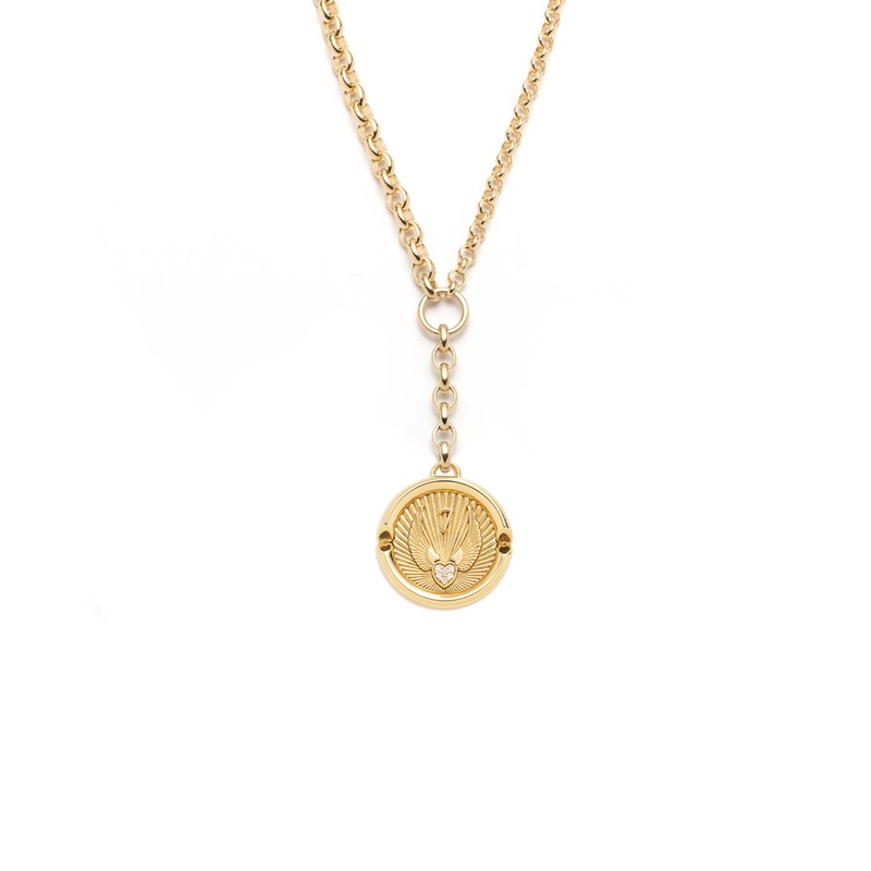 DescriptionHandcrafted in 18-karat Yellow Gold, this 16" Heavy Mixed Belcher Extension Chain Necklace combines two of our Tenets in a single medallion - True Love and Vivacity. With Wings we Fly When you and your pair come together, you lift each other up.
