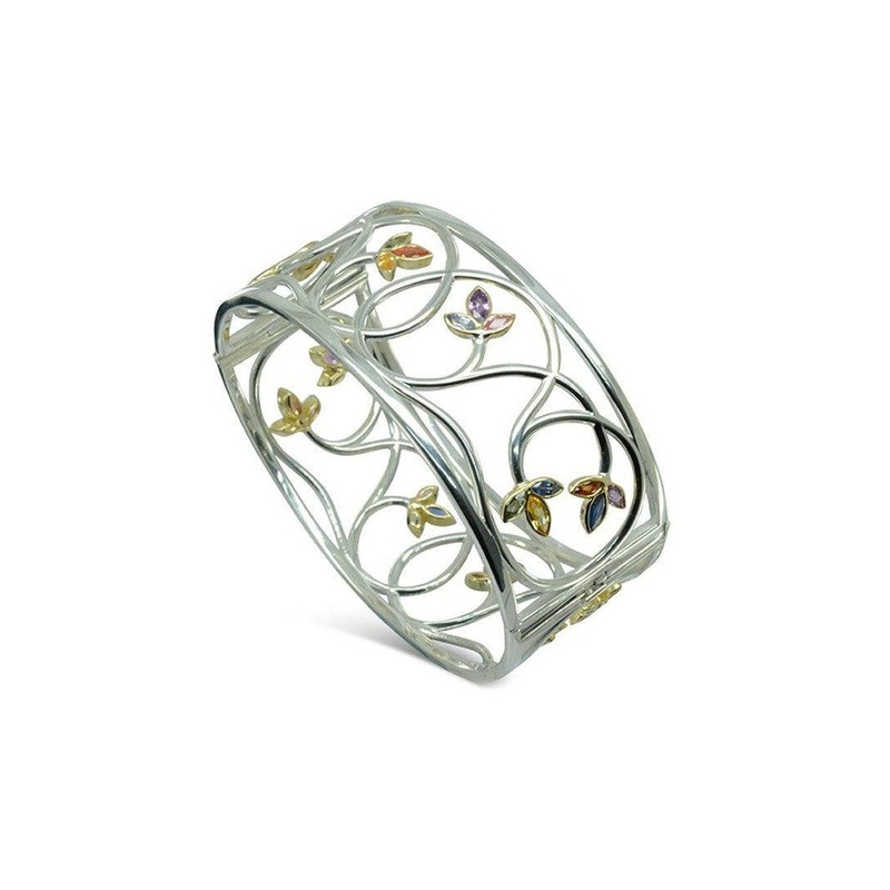 Unique Design:The Sapphire Gold Hinged Bangle features an art nouveau-inspired silver border and intricate wirework. The design is reminiscent of illuminated manuscript border designs, showcasing the fusion of artistic inspiration and fine craftsmanship.