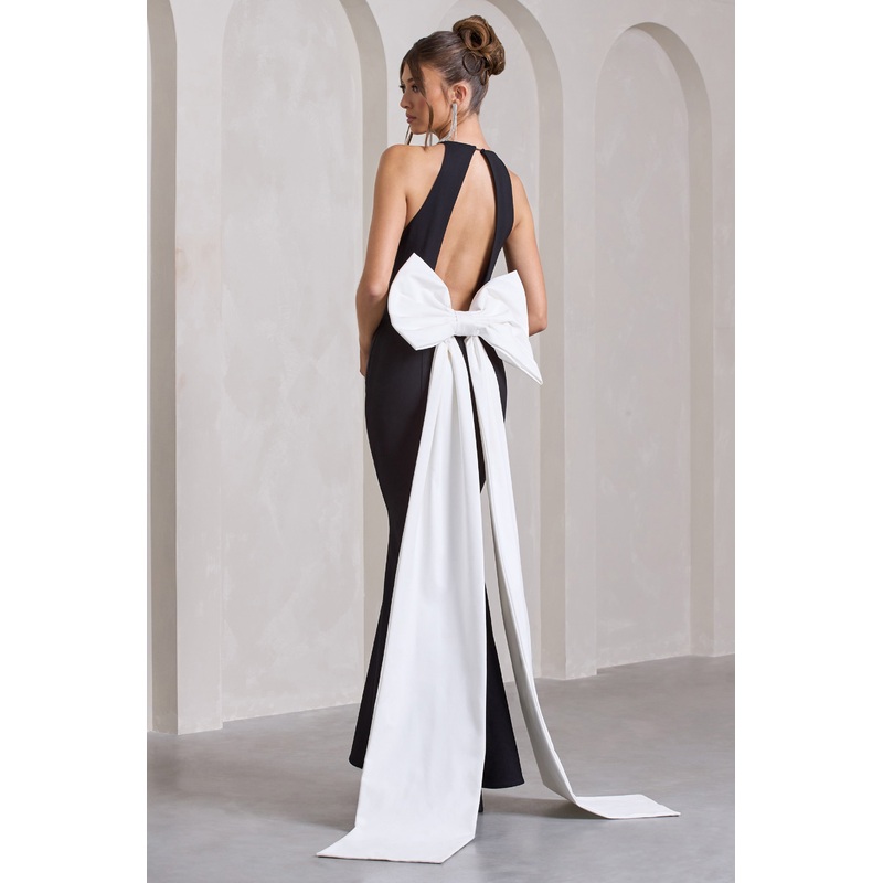 Bestow | Black Open-Back Maxi Dress With Oversized White Bow