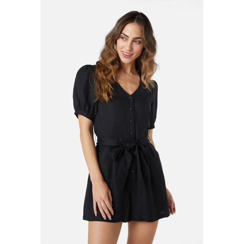 Black playsuit- v neckline and button through front- short puff sleeves- large darts for flattering waist fit- short length with a wide cut leg- handy side pockets- made of a linen cotton blend fabric- available in blackProduct Code: PGFW478