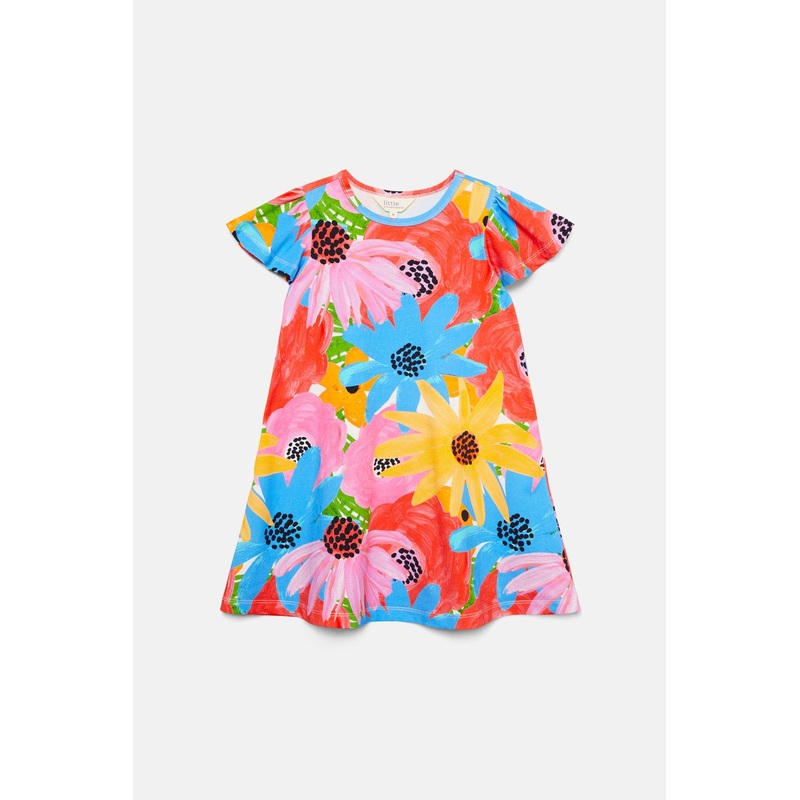 printed cotton elastane jersey kids dress- soft cotton elastane stretchy fabrication- rounded neckline- short length flounce sleeves - a-line skirt shaping - finishes at knee- perfect for everyday wear- features exclusive princess highway kids printProduct