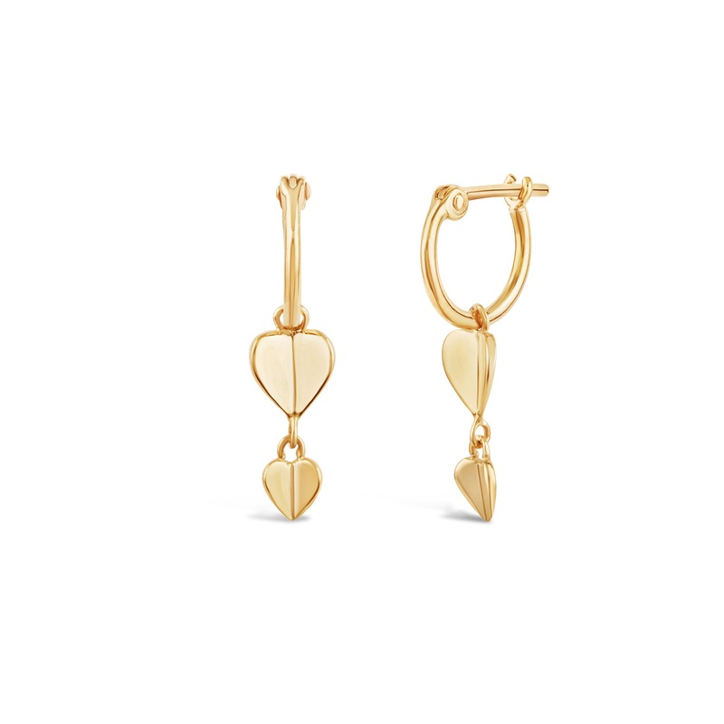 These Bijou Folded Heart Drop Hoops are made in recycled 9k yellow gold and feature two folded heart charms hanging from a small click hoop.Small but perfectly formed, these delicate mini-hearts from Dinny Hall both flutter and flatter.