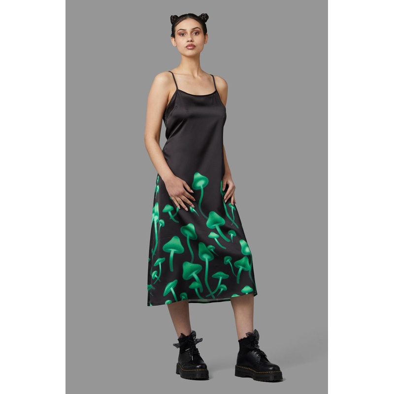 Maxi Dress – Fitted Shape – Tie At Back – Zip Closure – Rounded Neckline – Adjustable Spaghetti Straps – Placement ‘bioluminescence’ Print – Non-Stretch – Made From Polyester Satin – Available In Black
