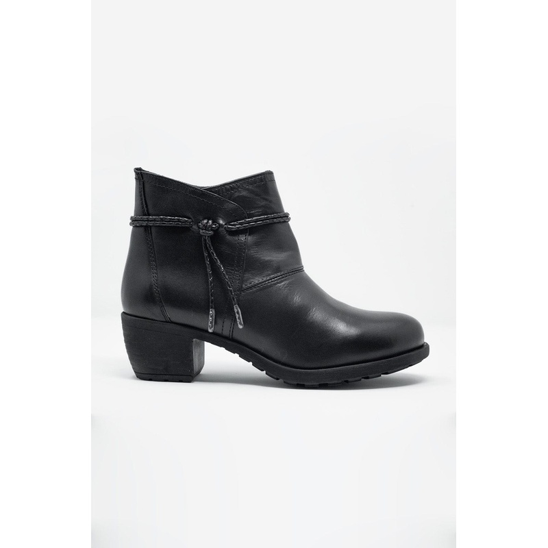 Black Blocked Mid Heeled Ankle Boots. Made in Spain from a rich black leather, these ankle boots have a round toe, rope detailing, and a 1.96-inch block heel. They flatter your ankles and legs when worn with skinny jeans or leggings and an oversized top or