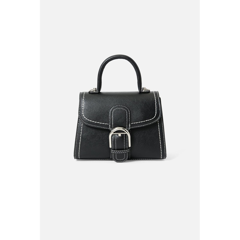 Black Buckle Handbag- A simple, elegant bag- Structured design- Vegan leather- Exposed contrast stitch- Gold toned hardware- Available in blackProduct Code: PWFZ152