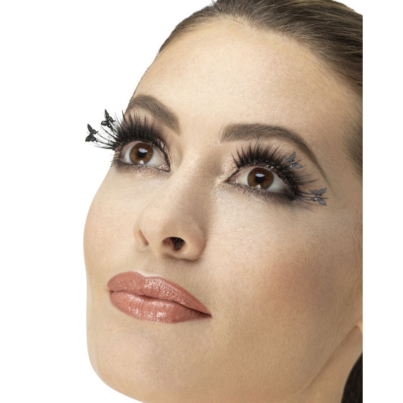 Flutter those lashes!These Black Butterfly Eyelashes are perfect for a fairy queen costume, witches costume or night out on the town. The lashes are made from long synthetic fibres and feature 2 small black butterflies on the tips of the lashes on each ban
