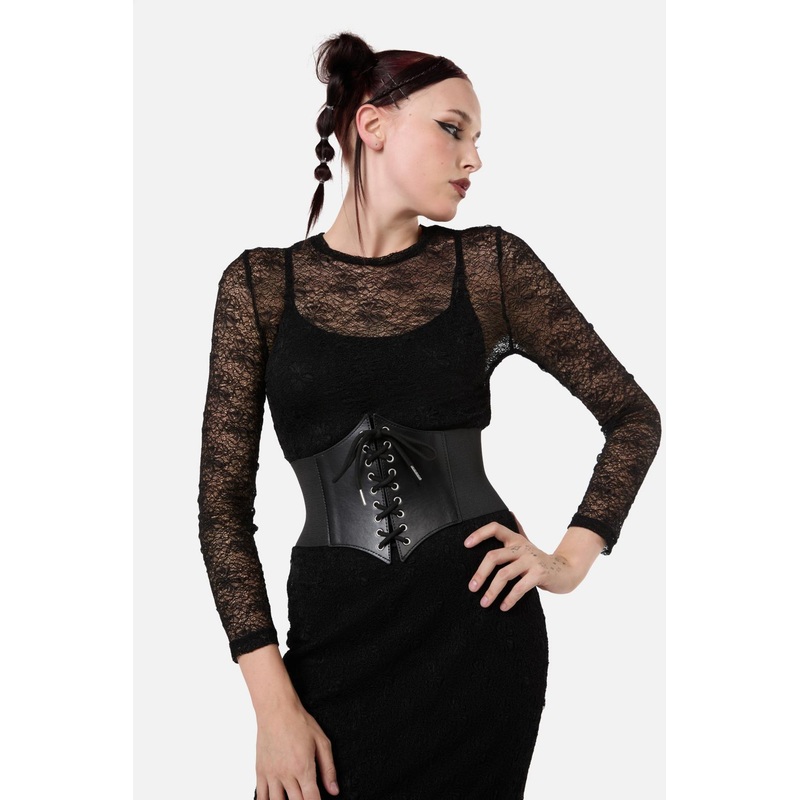 Black Corset Belt- A classic, staple accessory- Corset waist belt- Vegan leather- Silver toned eyelets- Elastic backing- Press stud fastening- Comes in sizes XS, S, M and L- Available in blackProduct Code: DWFZ120