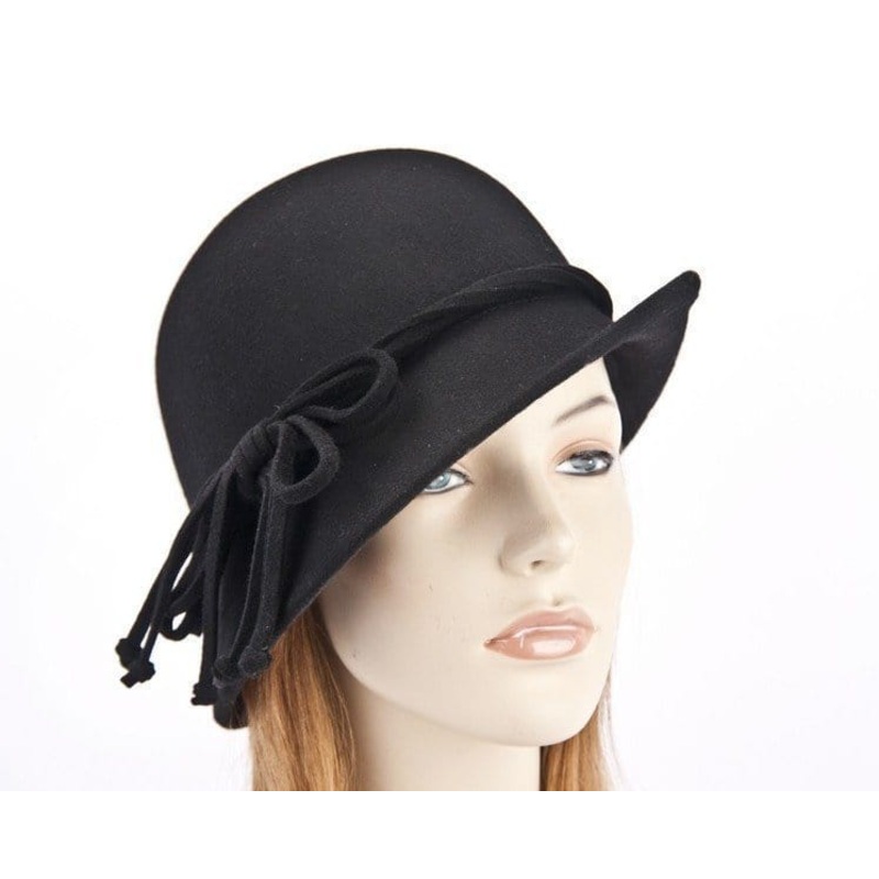 Classic black felt cloche hat with elegant trim. Made from pure wool felt with thin felt rope trim, this is an excellent hat for Australian winter.