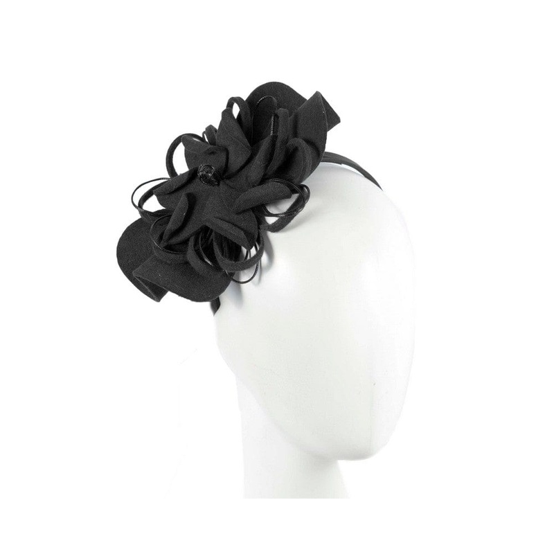 Large black flower made from finest wool felt and timed with black cord. This stylish fascinator is made with autumn and winter racing in mind and will be a perfect addition to your outfit.Designed in Australia by Max AlexanderReal wool feltComfortable hea