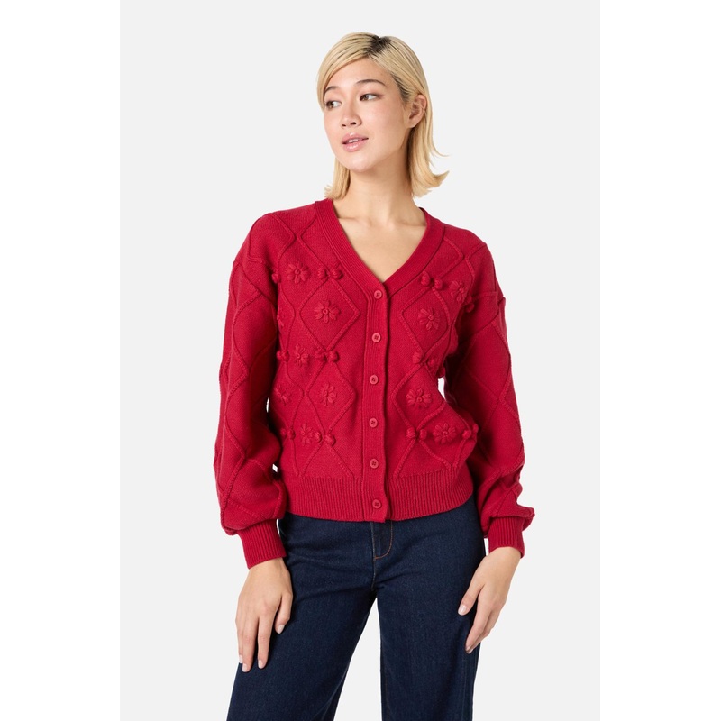 Cosy cotton blend knit cardigan. A relaxed v neck style, hand embroidered with sweet flowers - diamond styles knit structure with bobbles - v shaped neckline - relaxed fit through body - full length soft balloon styled sleeve - ribbed hem, sleeve cuff neck