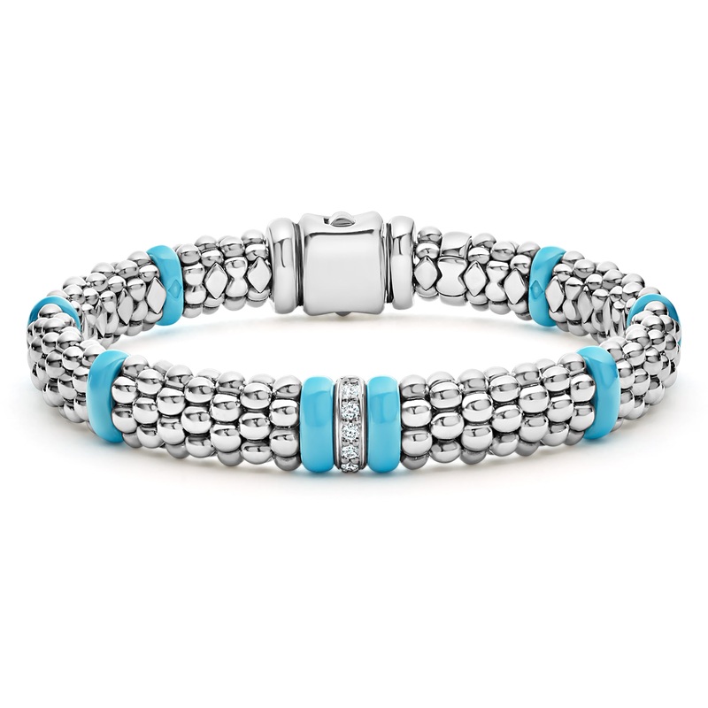 A single diamond station set in sterling silver surrounded by blue ceramic and Caviar beading. diamonds are the highest quality natural stones.