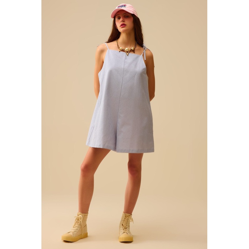 Breezy and effortlessly playful, this blue striped playsuit is made for sun-drenched days and easygoing adventures. Crafted from a lightweight woven fabric, it features a relaxed silhouette with a flattering square neckline and adjustable shoulder ties tha