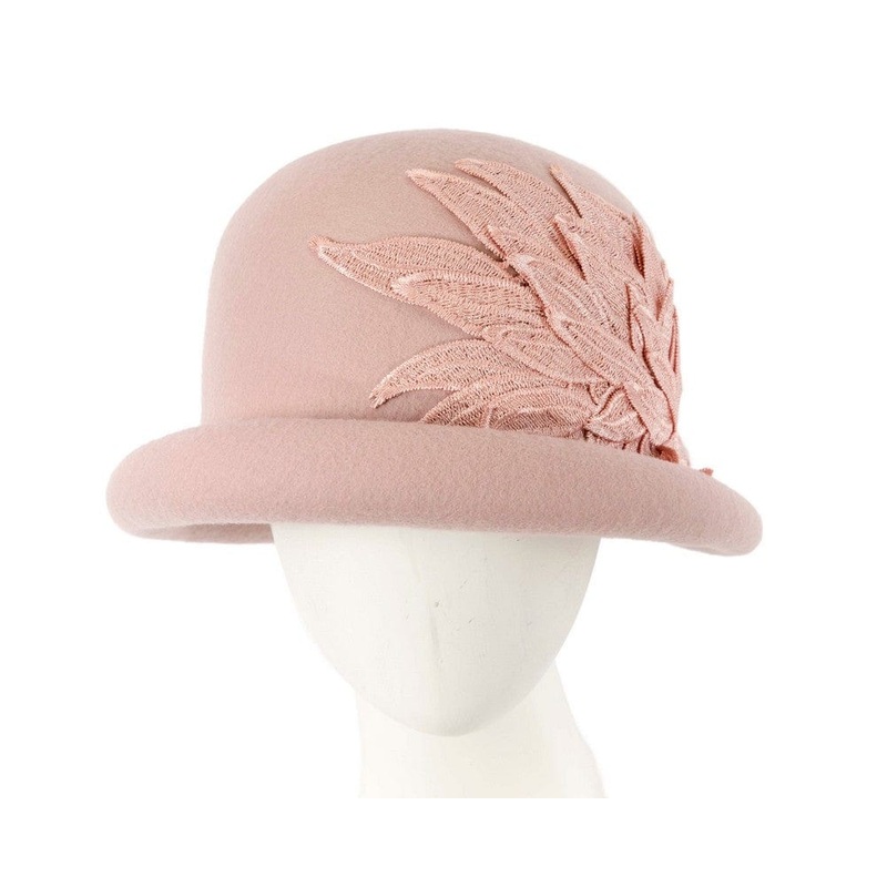 Blush pink cloche made from pure wool felt and decorated with luxurious lace. This hat features unique upturned brim and will be a perfect addition to your next fashion winter outfit. Made in Australia Cloche hat Felt winter hat Fits up to 58cm