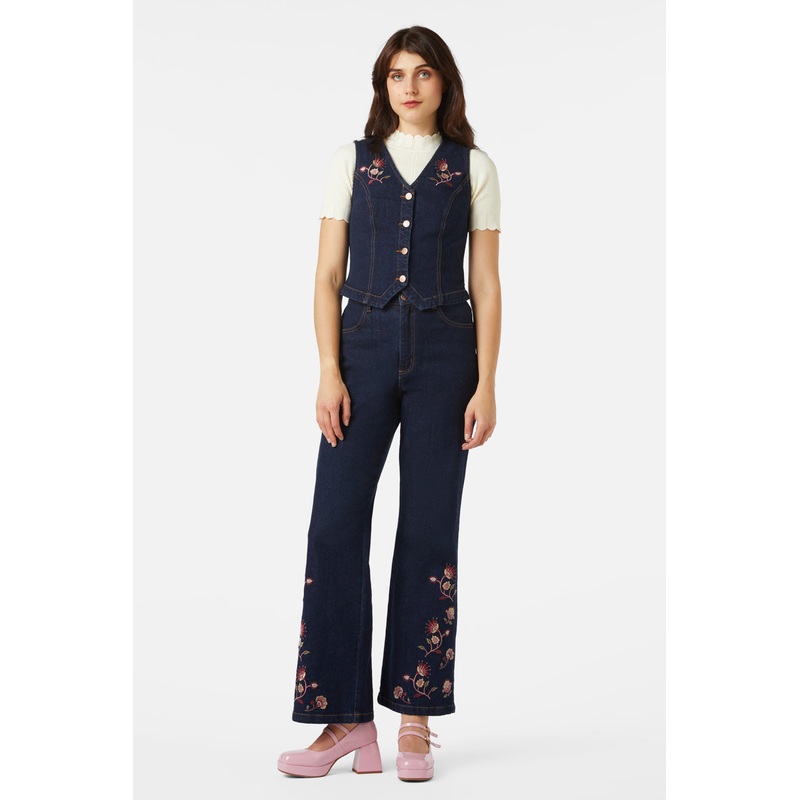 Paisley embroidered denim vest- ornamental paisley swirls embroidered around neckline- front button opening- v neck line with embroidery embellishments- can be paired with the matching embroidered denim jean- mid length finishing just below the waist- semi