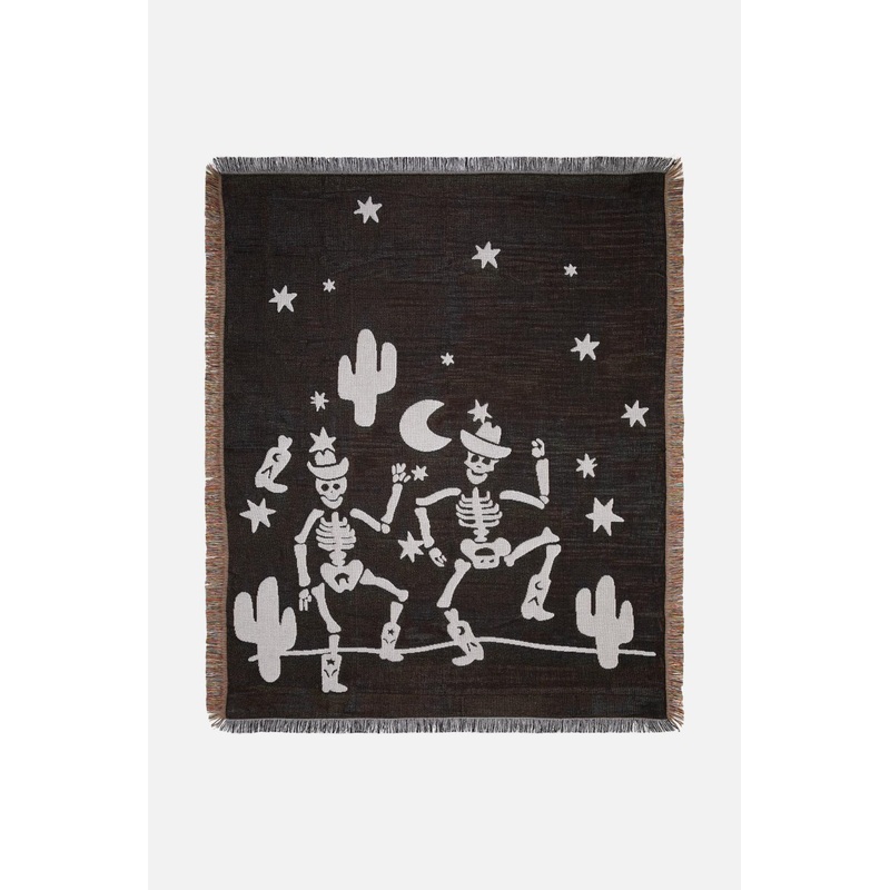 Boothill Throw- A Black Friday exclusive- Use as a tapestry or throw- Black with fun dancing skeleton design- Western inspired- Throw measures approximately 130cm x 160cm (including fringe)Product Code: BWFZ010