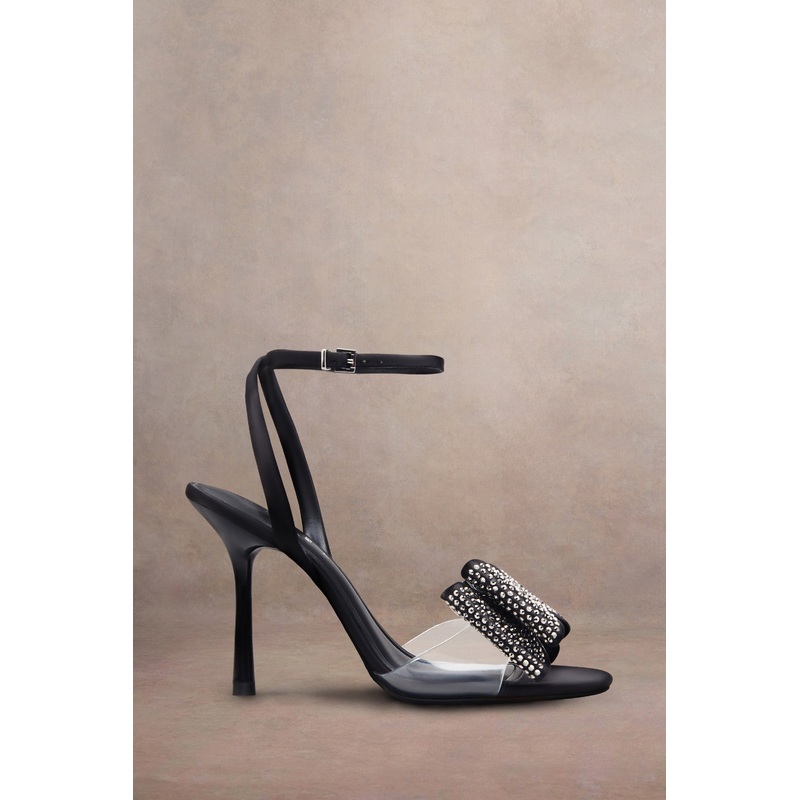 Bowing | Black Satin Heeled Sandals With Diamante Bows