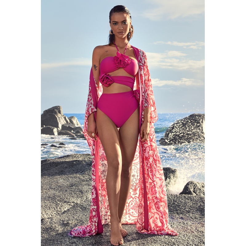 From boat parties to beach bars,Breatheis a piece your poolside wardrobe deserves. This chiffon maxi cover-up arrives in a bold pink porcelain print and offers a custom fit through its adjustable drawstring waist and self tie straps. Style yours over our K
