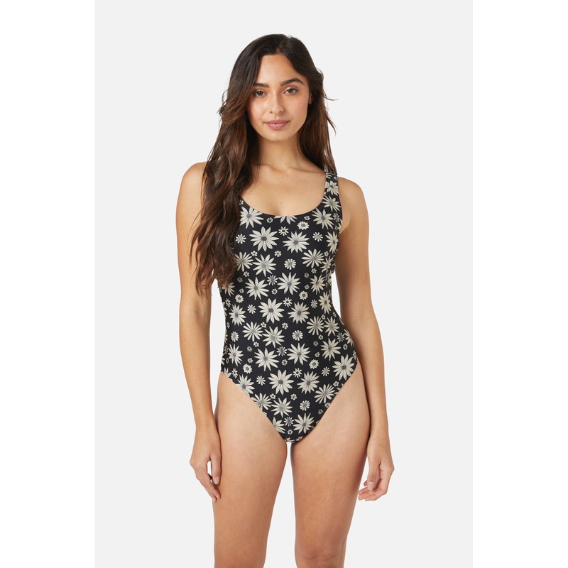 Two tone floral printed one piece swim suit- A fresh spring daisy floral with a classic forever vibe- scoop neck- thick shoulder straps- scoop back- removable cups- full body coverage- nylon elastane blend swim fabric- available in blackProduct Code: PGFW3