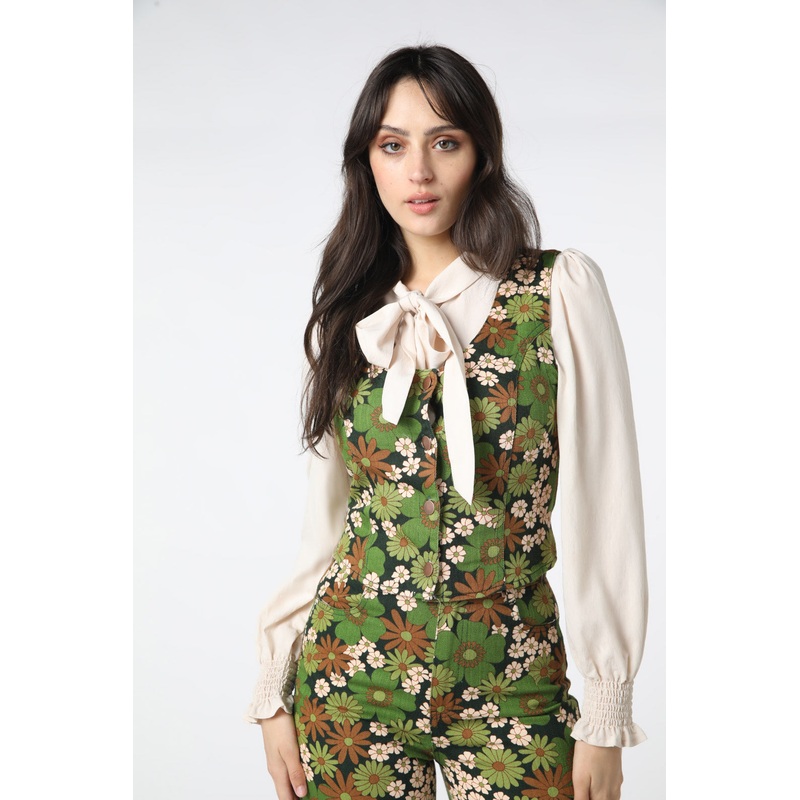 Floral printed vest- layers of vintage flowers create a beautiful print with a cool retro 70s vibe - layer over a blouse or knit top or wear on its own- deep rounded neckline - front shank buttons closure - straight hem shaping - made of a cotton drill - a