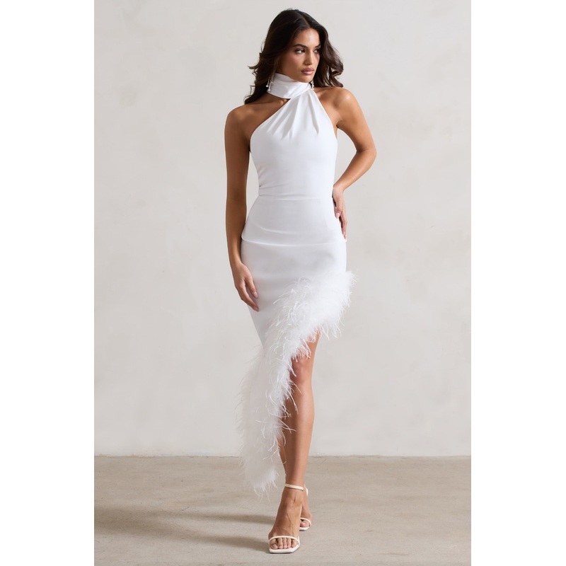 Glamorous and elegant are two words to describe this aptly-named maxi,Brilliance. Expertly crafted in a premium sculpting crepe, this white style has multiple elevated details that make this a stand out dress.Brillianceboasts a modest high neckline complemented by a romantic asymmetric skirt trimmed with fluffy feathers. Pair this opulent occasion dress with some subtle gold accents and classic court heels for a formal look.
