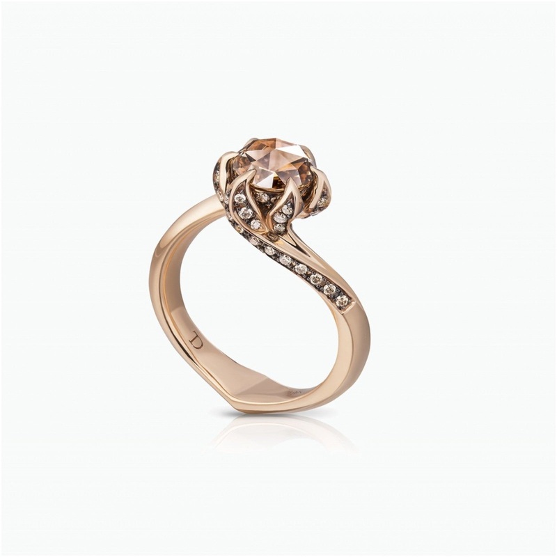 The enchanting effect of Tomasz Donocik's 18-karat rose gold Lilly Pad Ring is achieved by enrobing an eye-catching "lilly pad" brown diamond with beautiful pav brown diamonds which draw the eye to this unique design. Featuring vibrant rose gold with brown