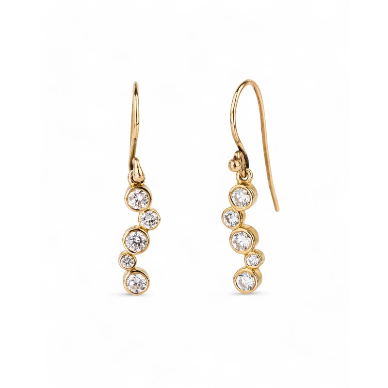 The Water Bubbles Diamond and Yellow Gold Drop Earrings arehandmade in 9ct yellow gold and feature 0.75cts of round brilliant diamonds.