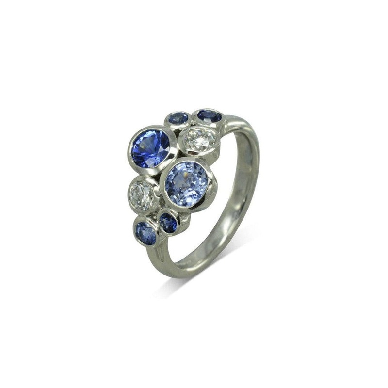 The Water Bubbles Sapphire and Diamond Platinum Cluster Ring is the perfect gift for a sapphire anniversary or a September birthday. Celebrating the beauty of sapphires in various shades of blue,this ring takes advantage of a selection of indigo and paler