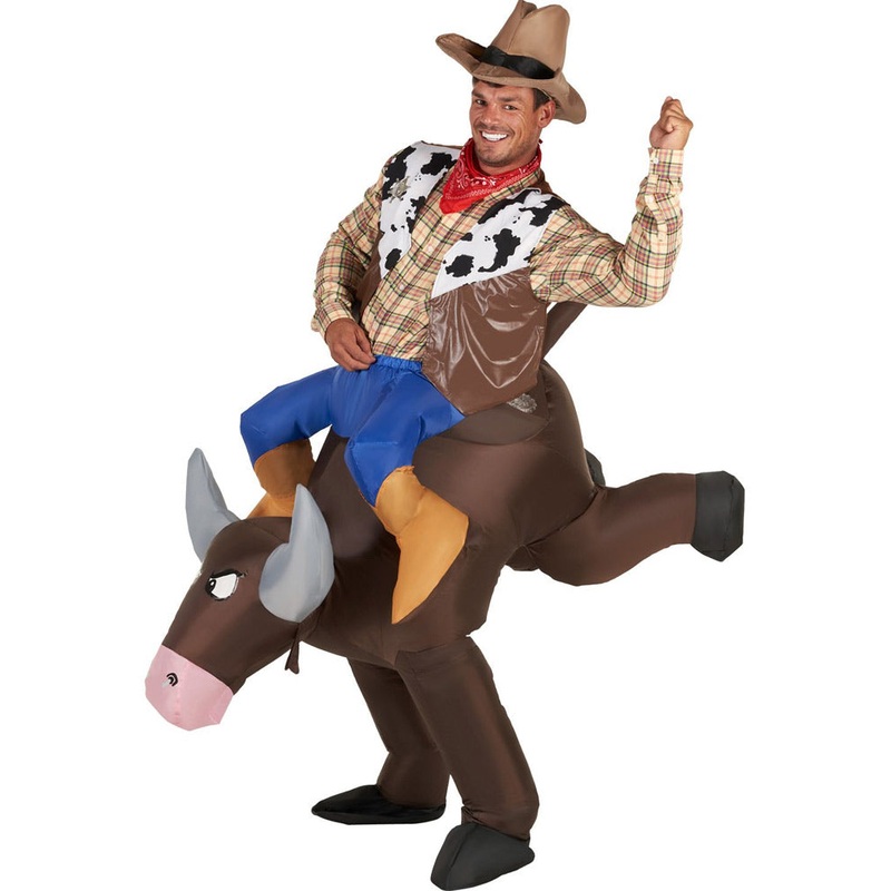Item Includes:Inflatable horse costume.Sizing:See size chart image for details.Materials:100% Polyester.Hand wash, hang dry.Please note: Cowboy shirt, vest, bandana and hat not included.Yehaw!Get ready for the rodeo in this Bucking Bronco Ride On Inflatabl