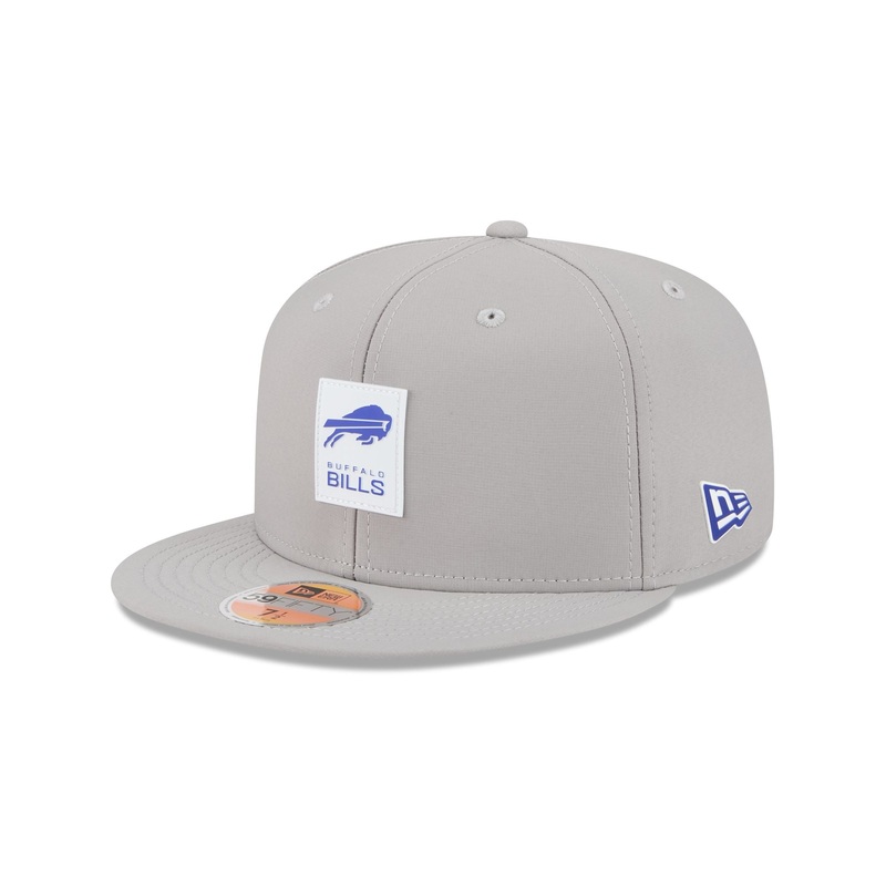 The Buffalo Bills 2025 Sideline Hot Weather Gray 59FIFTY Fitted Cap features a sewn-down silicone Bills logo patch at the front panels with a matching Official NFL Shield logo at the rear. The cap has a water-repellent quill tech fabrication throughout, wi