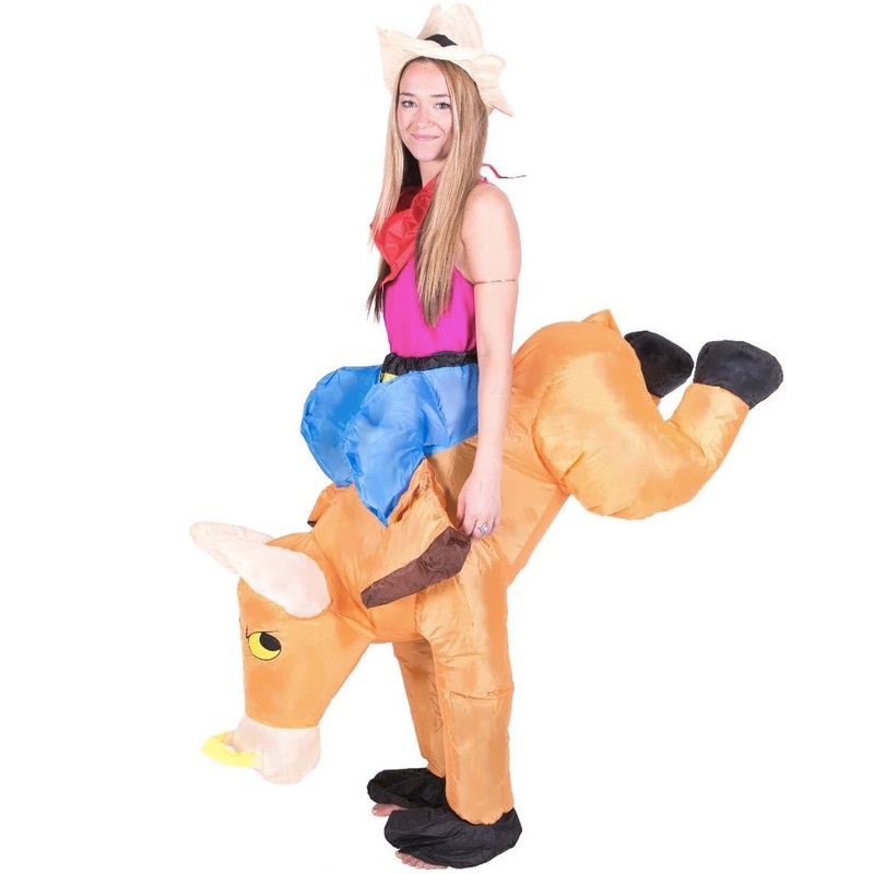 Be the life of the party in this fun Bull Rider Inflatable Adult Costume. With an easy slip-on, one-piece design, you’ll be ready to party in no time. The fan inflates the costume and lasts up to 7 hours see instruction image for further details. This costume features a brown ‘bull’ inflatable animal with black hooves, beige horns and a yellow nose-ring. Blue inflatable ‘legs’ attach to the wearer’s waist to make it look like they are riding the bull. Perfect for themed dress-up parties, stag and hens nights, or even just brightening up a family event.