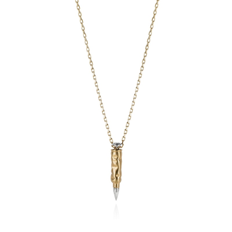 The Bullet Peace is a pendant in 18kt yellow and white gold.Part of theBullet Peace Collection by Julien Riad Sahyoun.Each Bullet Peace alimited edition of only 333 pieces, paying tribute to Julien's beloved friend Leila Alaoui, as a symbol of hope in turb