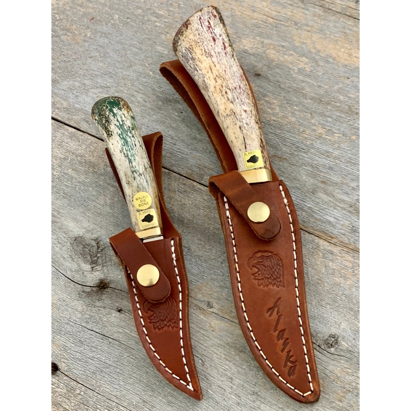 This handle is made from fossilized Walrus Rib Bone. The blade is 440 stainless steel.Blade Length: 5" Total Length: 10"Leather Sheath included