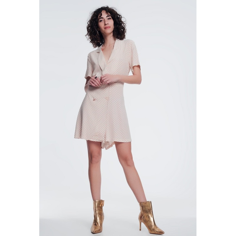 Button Front Jumpsuit in Beige. This short jumpsuit, or playsuit, boasts of a V-neck, button closure, tuxedo neckline, relaxed fit and a polka dot print. It almost looks like a cross between a shirt dress and a romper. This jumpsuit could take you to any p