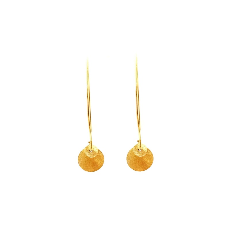 Long simple 18kt gold plated disc earrings. 2 inch long, pierced.