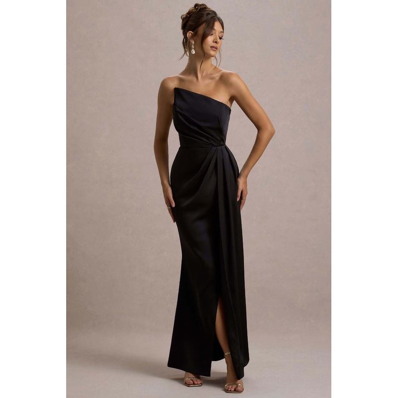 Cairo | Black Satin Strapless Draped Maxi Dress