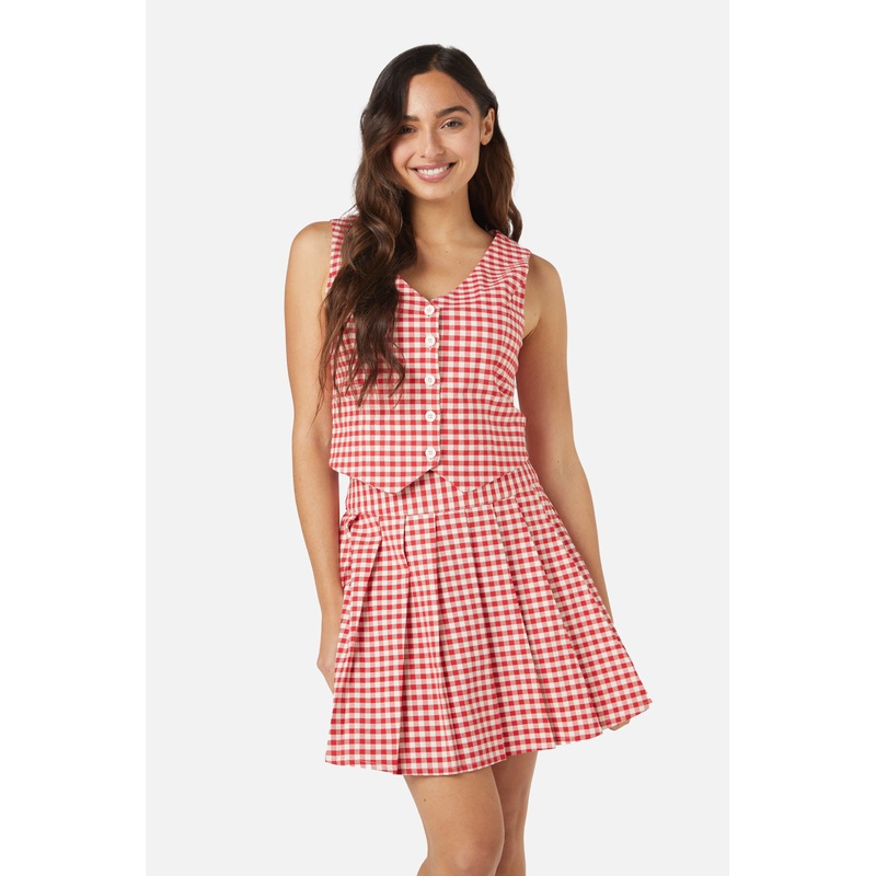 Check tailored vest- a classically sweet check vest to layer over a blouse or knit top- fitted vest- deep v neckline- front button closure- pointed hem shaping- cotton fabric with a little elastane, 100% cotton lining- available in black & redProduct Code: