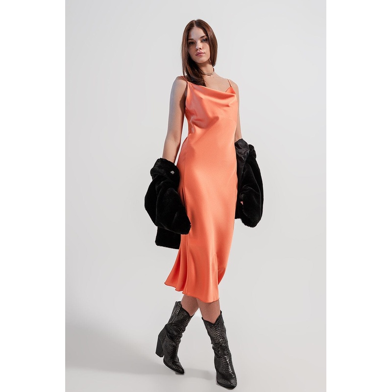 Cami Midi Slip Dress In High Shine Satin In Orange