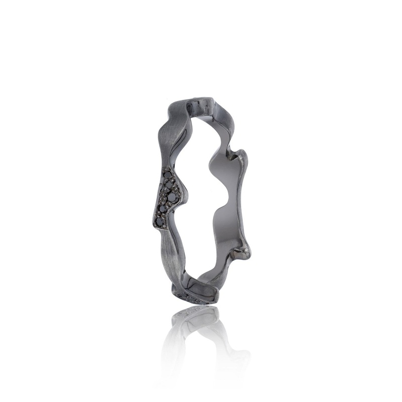 TheCamo 925 Shadow Diamond Ring is handmade in London's Hatton Garden fromrecycled sterling silver overlaid with black rhodium, featuringblack diamonds.Inspired by the shadows cast on the forest floor as the sunshines through leafy canopies.Part ofbiiju's