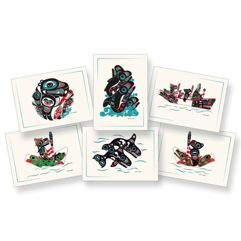 Tlingit formline designs by Israel ShotridgeCollection of Six 5 X 7 Art Card includeGoing to the PotlatchSalmonCanoe JourneyRaven & Frog CanoeOrcasEagle & Bear Canoe