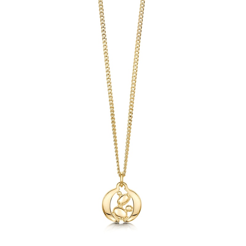 This small Captivate pendant necklace in classic 9ct yellow gold features pebbles of varying shapes and sizes, caught between two moon-shaped golden curves. This piece delicately hangs from a gold chain and measures approximately 12mm in diameter.