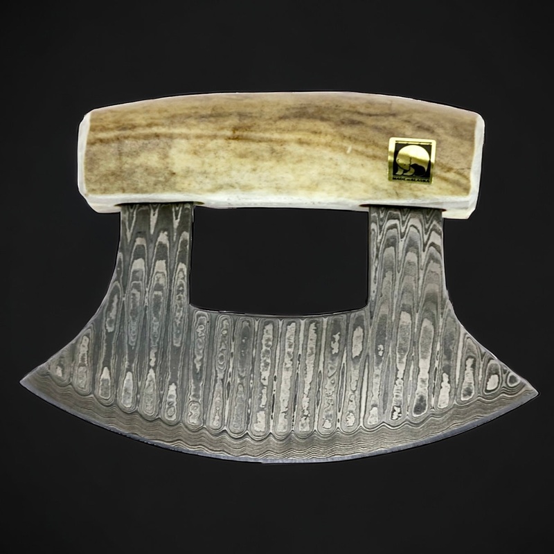 Made In Alaska Shed Caribou Antler Ulu Knife5 1/2" Damascus Steel bladeCaribou Antler Stand is IncludedChopping board sold separately...