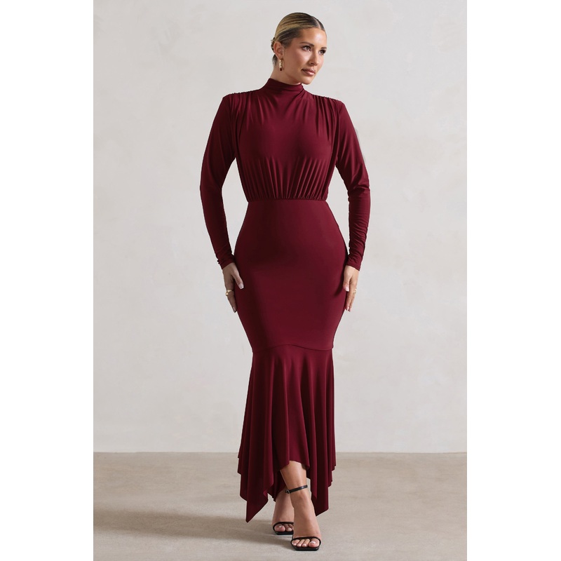 If sophistication was a dress,Carla would be it. Thisberry maxi dress showcases a modest silhouette featuring a high neckline, flattering gathered waist and feminine long sleeves. Finished off with a draped hem style Carla with some court heels and our sta